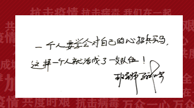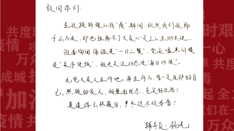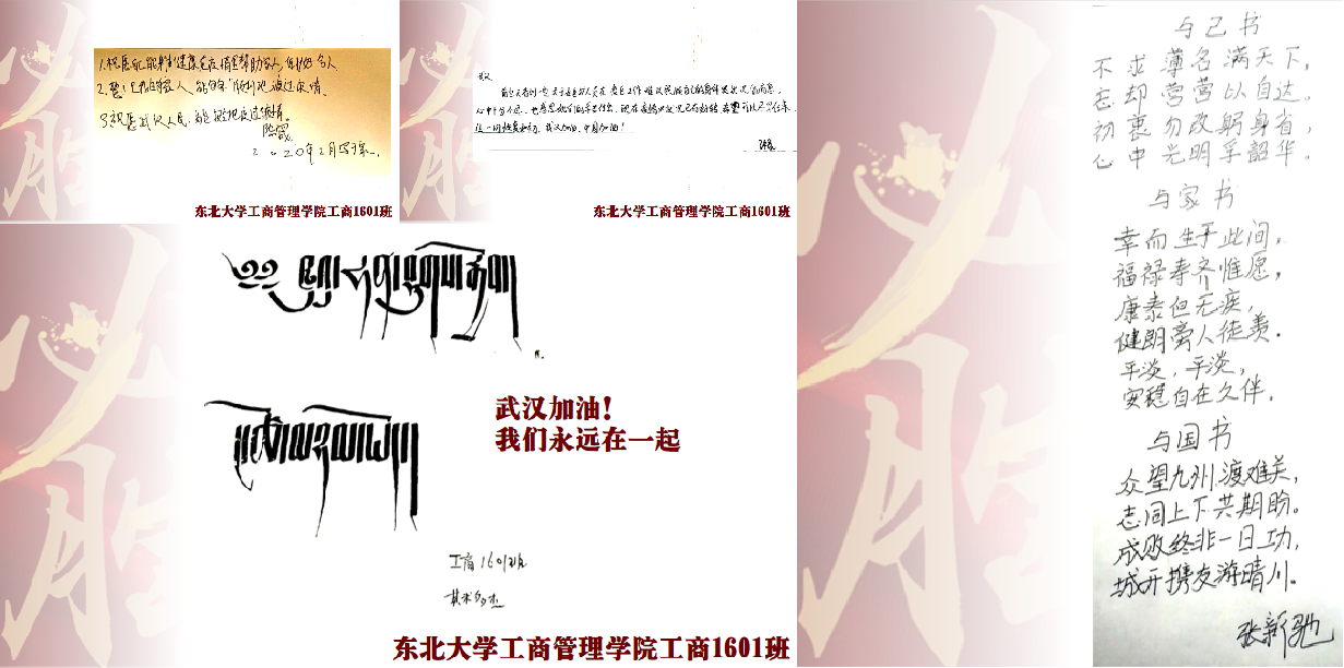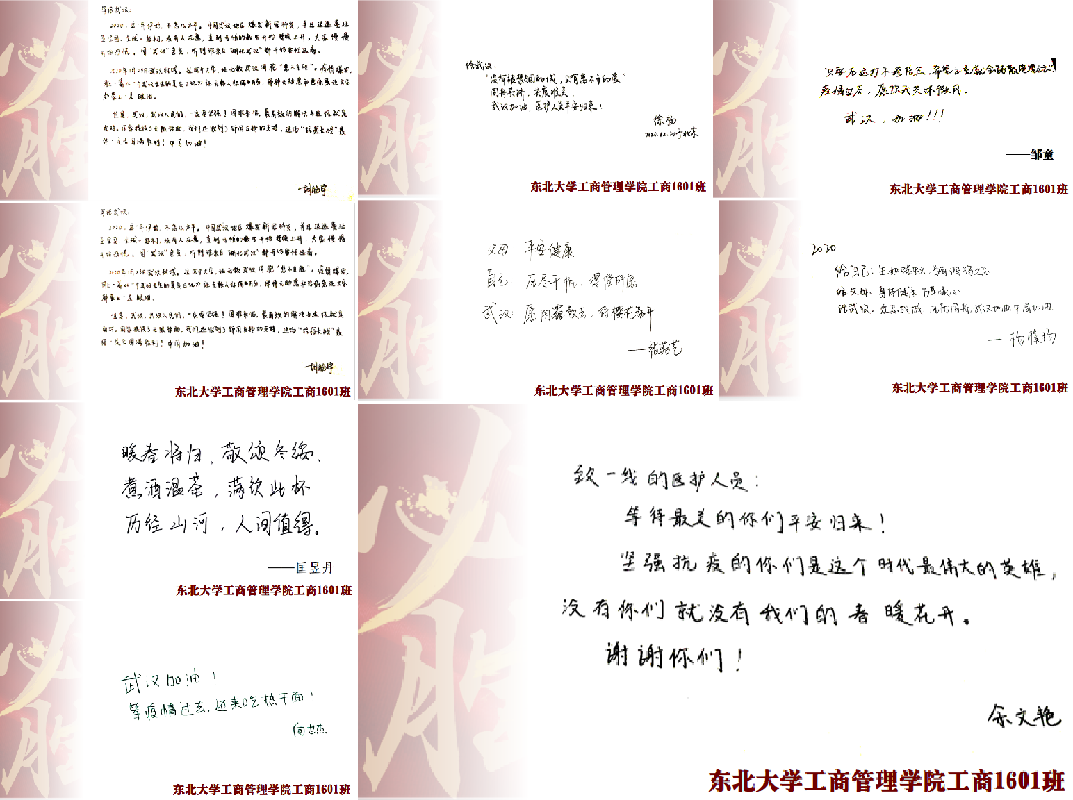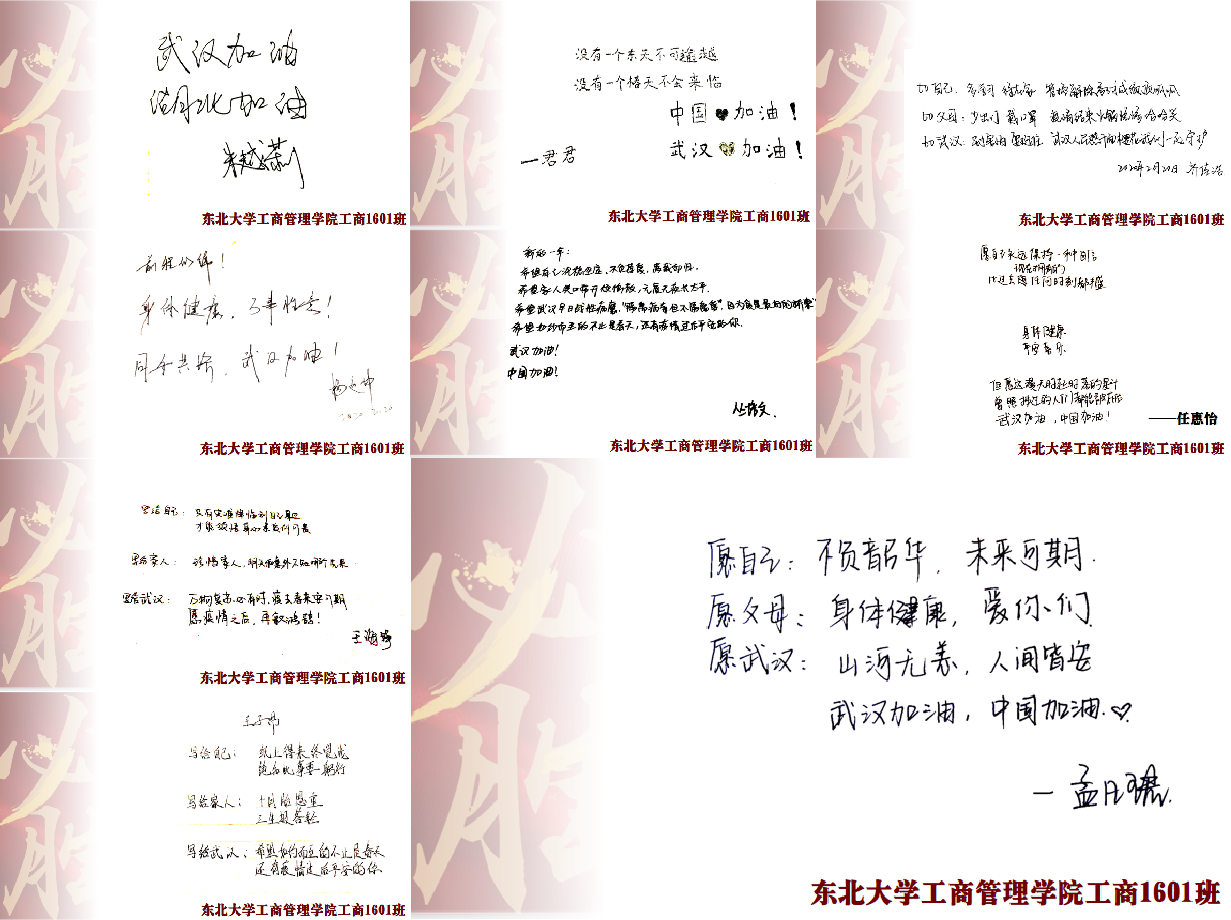 作为有责任有担当的当代大学生,同学们的理智发声,无私奉献,便是面对疫情抗战的最佳支援。在此,工商1601团支部成员以文字为载体,为自己留下最难忘的回忆,为父母写下最温情的语言,为武汉献上最诚挚的祝福。愿祝福穿越万水千山,用文字汇聚成坚韧的力量,助力夺取抗击疫情斗争的最终胜利。(图/文 2016级本科生团总支)